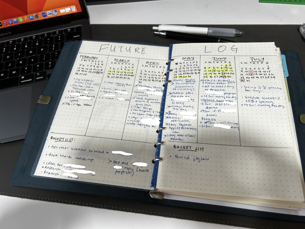 - It is ok to mix personal life and work: I learnt that personal to-dos and work to-dos can co-exist in the same journal, and it is very effective when combined this way. I used to have a notebook exclusively for work notes, work to-dos are on post-it notes in the office, and personal to-dos are in the phone calendar. Super scattered.