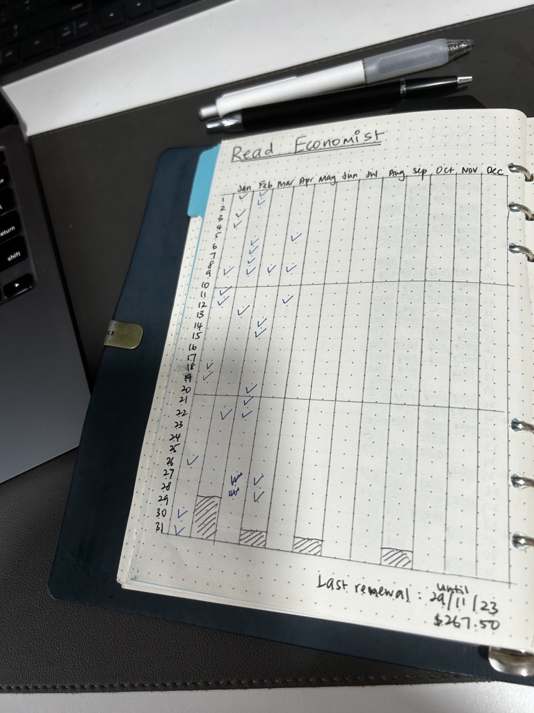 I track 2 daily habits: whether I manage 10,000 steps, and if I have read articles from the Economist. The first, to take baby steps towards a basic active lifestyle, and the second, because I have started an annual subscription to the Economist and want to have an objective view of my usage when it comes up for renewal in November.