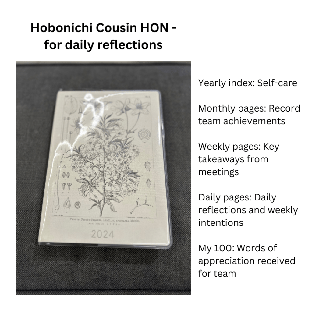 One of my priorities this year is to grow as a leader, and documenting daily reflections is a good way to embark on this journey. I have dedicated the Hobonichi Cousin HON for this purpose.