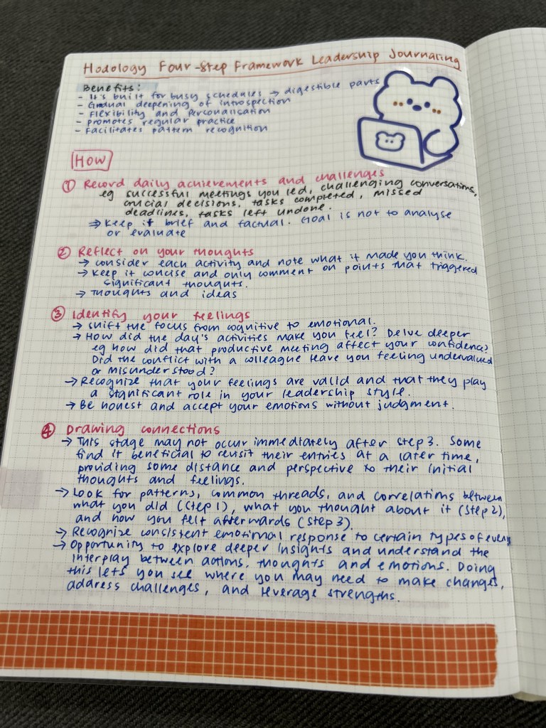 When researching about leadership journaling, I came across an article on LinkedIn about Hodology’s Four-step framework for enhanced self-awareness. This became one of my first notes in my reflections journal and how I’ve structured my daily reflections so far. Let’s see how this works out for the year and I shall share my experience at a later stage.